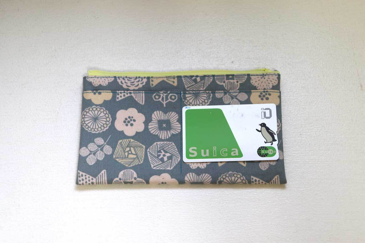 外ポケットは中央に仕切りを入れた時の横幅がカードサイズです。