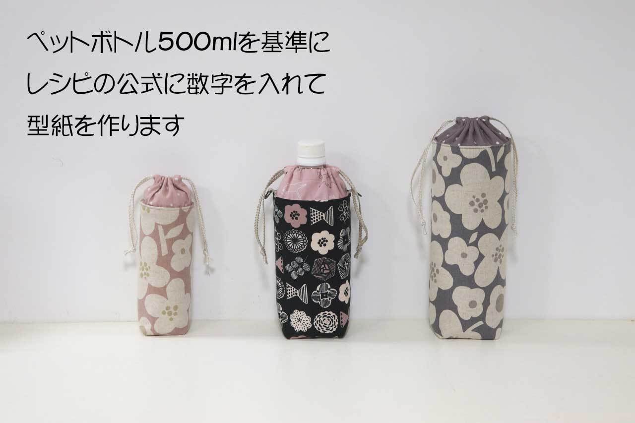 基本サイズはペットボトルの500mlで、少し太めの600mlも入ります。同じ型紙で350mlも作れます。
