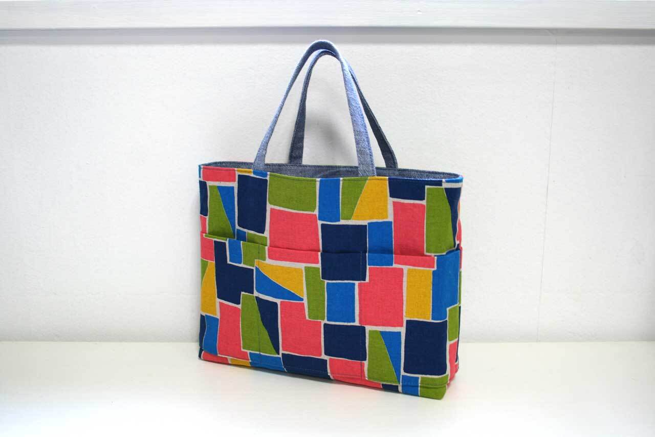 裏地付きバッグの基本形に、外ポケットをぐるりとつけた形です。