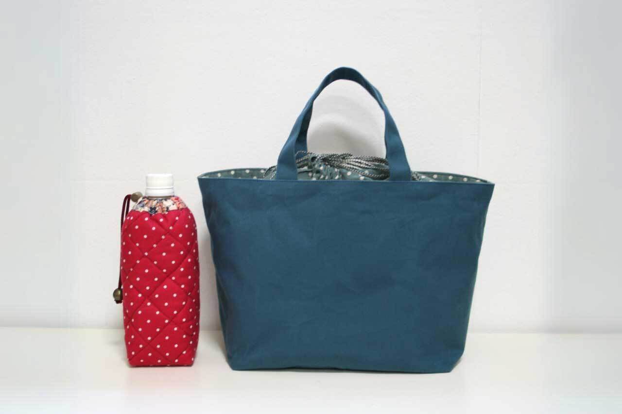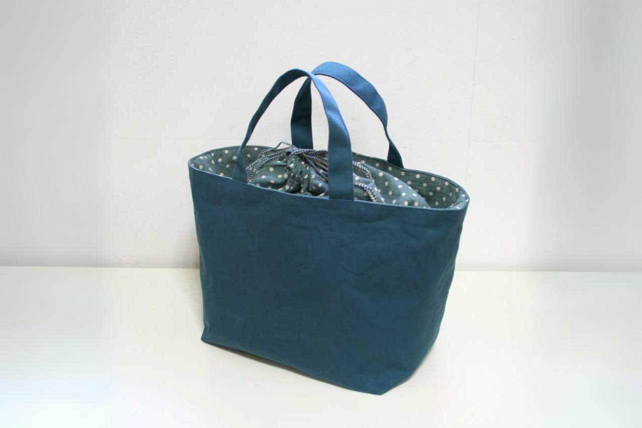 舟形のトートバッグに巾着型のフタをつけた形です。